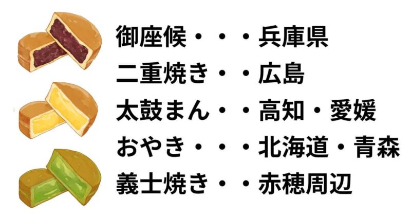 結論から言うと、呼び名が違っても基本的な味や作り方に大きな違いはありません。どれも小麦粉の生地に餡を挟んで焼いた、同じカテゴリーのお菓子です。